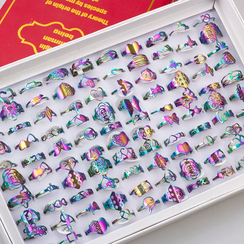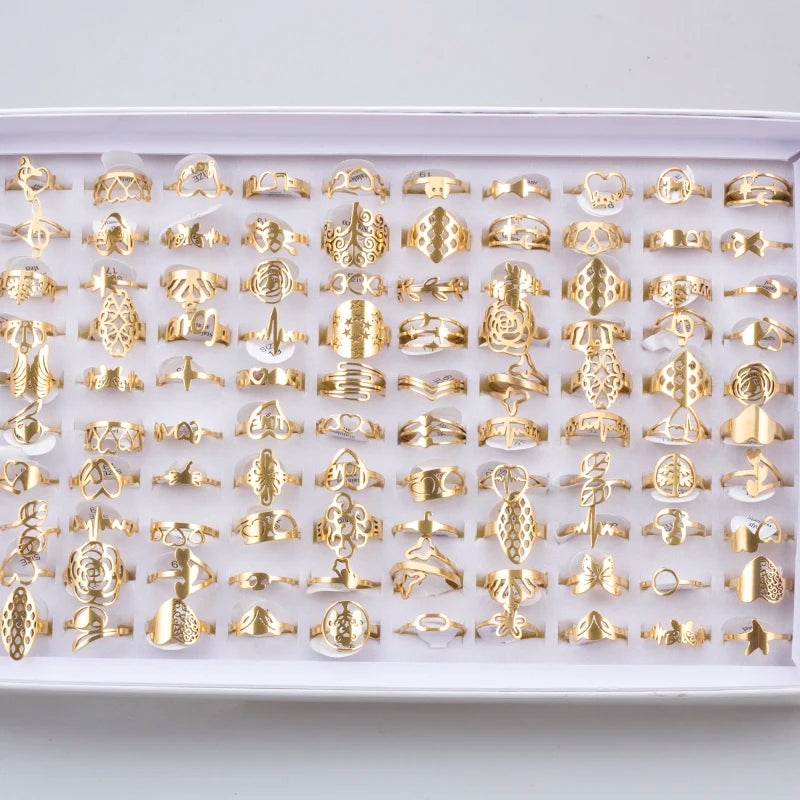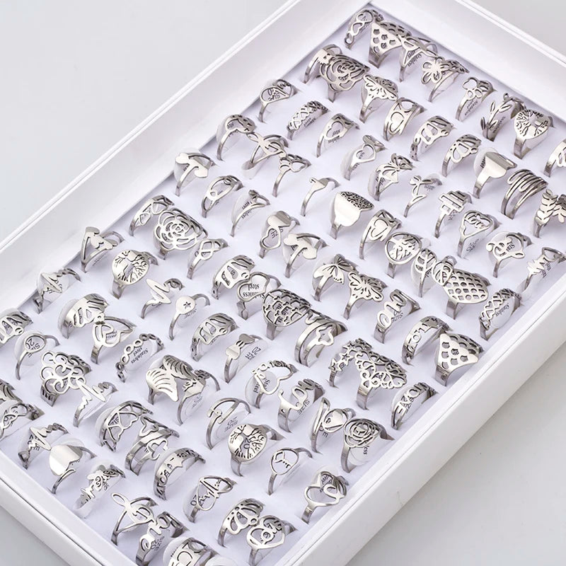 100 Pieces Stainless Steel Engraved Rings for Men and Women Fashion Charm Jewelry Gift Hollow Flower Finger Rings Wholesale Lots