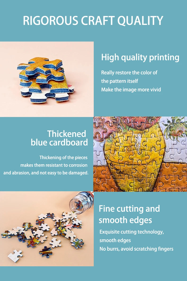 • Famous Artwork Designs :Featuring famous oil paintings by Van Gogh, The Great Wave off Kanagawa, and Sunflower, this puzzle adds an artistic touch to your puzzle collection.
