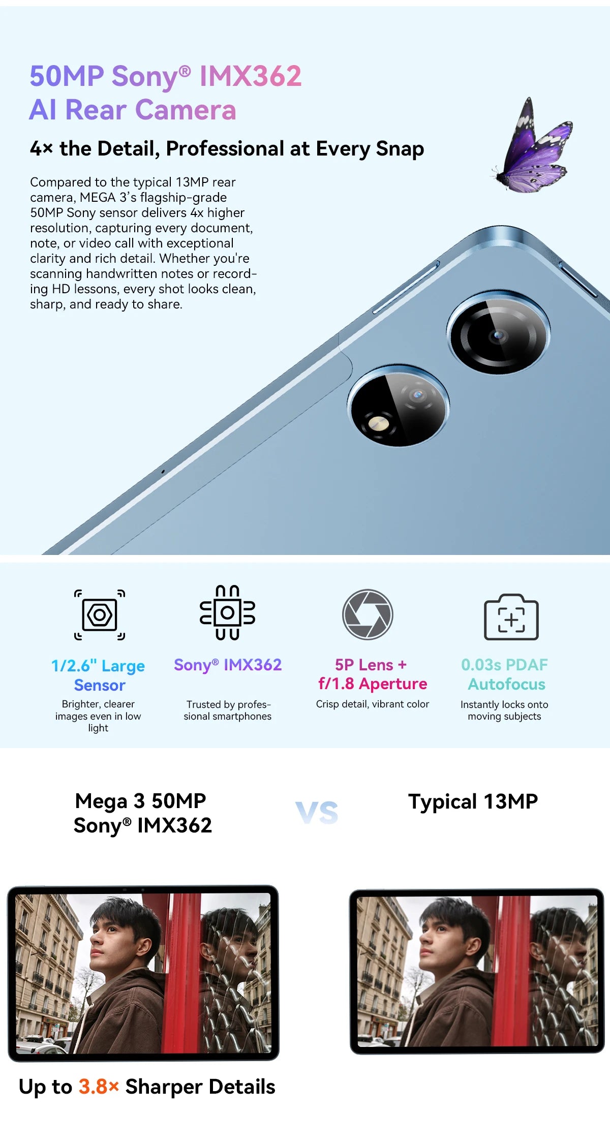50MP SONY® IMX362 Camera & 2MP Depth Camera |