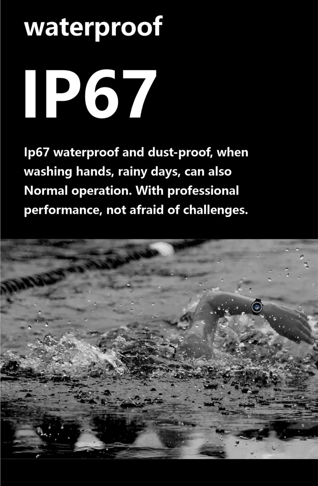♦Waterproof: It is just IP67 life waterproof allow the watch to be used normally when washing hands and in rainy days, but not allow to swimming and bathing. It is not allowed to soak the watch in water! (Please be careful to avoid corrosive liquids like hand sanitizer, soap enter the watch and cause component damage.)