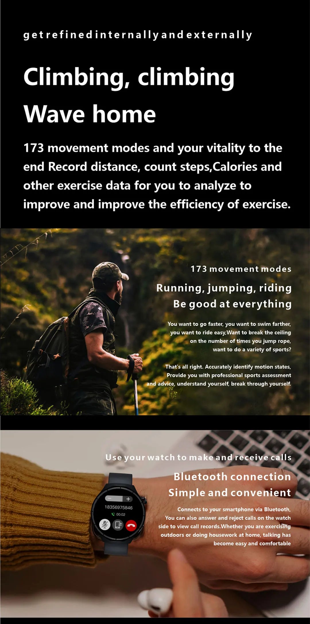 Function: Passometer,sleep tracker,Message Reminder,Call Reminder,Answer Call,Dial Call,REMOTE CONTROL,Push Message,Big Three Needles,24 hour instruction,Chronograph,Alarm Clock,Calorie Counter,Power Reserve,Perspective Window,week,Month,Heart Rate Tracker,Interactive Music,Noctilucent,Calendar,Countdown,Calculators,Oxymeter