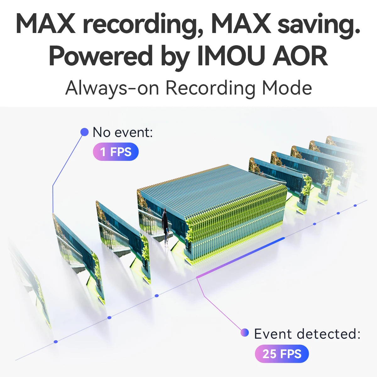 Efficient recording and storage balance (MAX recording, MAX saving): Relying on the IMOU AOR continuous recording mode, recording at a low frame rate of 1 FPS when there are no events, greatly saving storage space; When an event is detected, it automatically ramps up to 25 FPS for high frame rate recording, clearly capturing key images, taking into account long-term recording and detail retention of important moments, achieving the optimal solution for recording and storage.