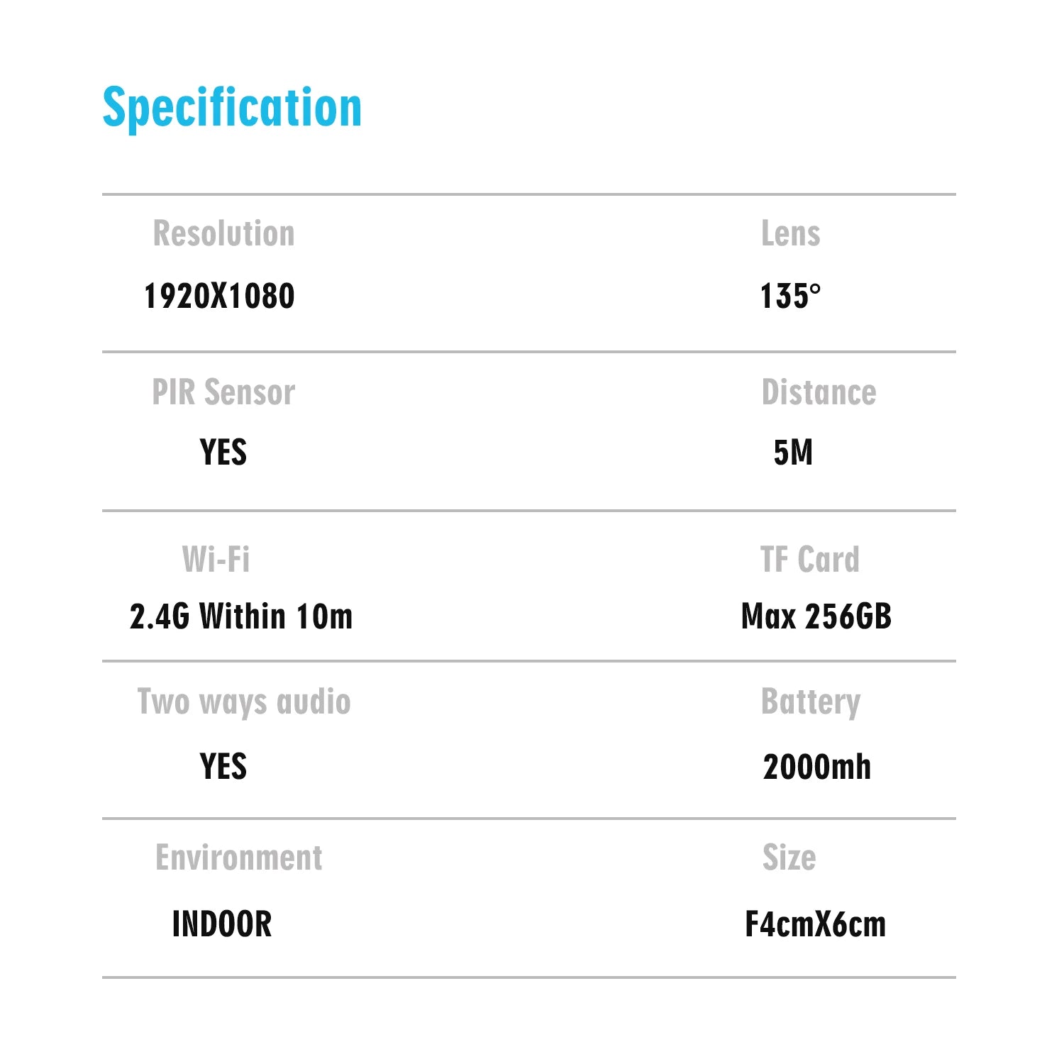 Mini Battery Camera, built-in 2000mah battery for long time standby, built-in speaker and MIC, two way audio.PIR body sensor motion detection, 135° wide-angle lens, wider field of view.