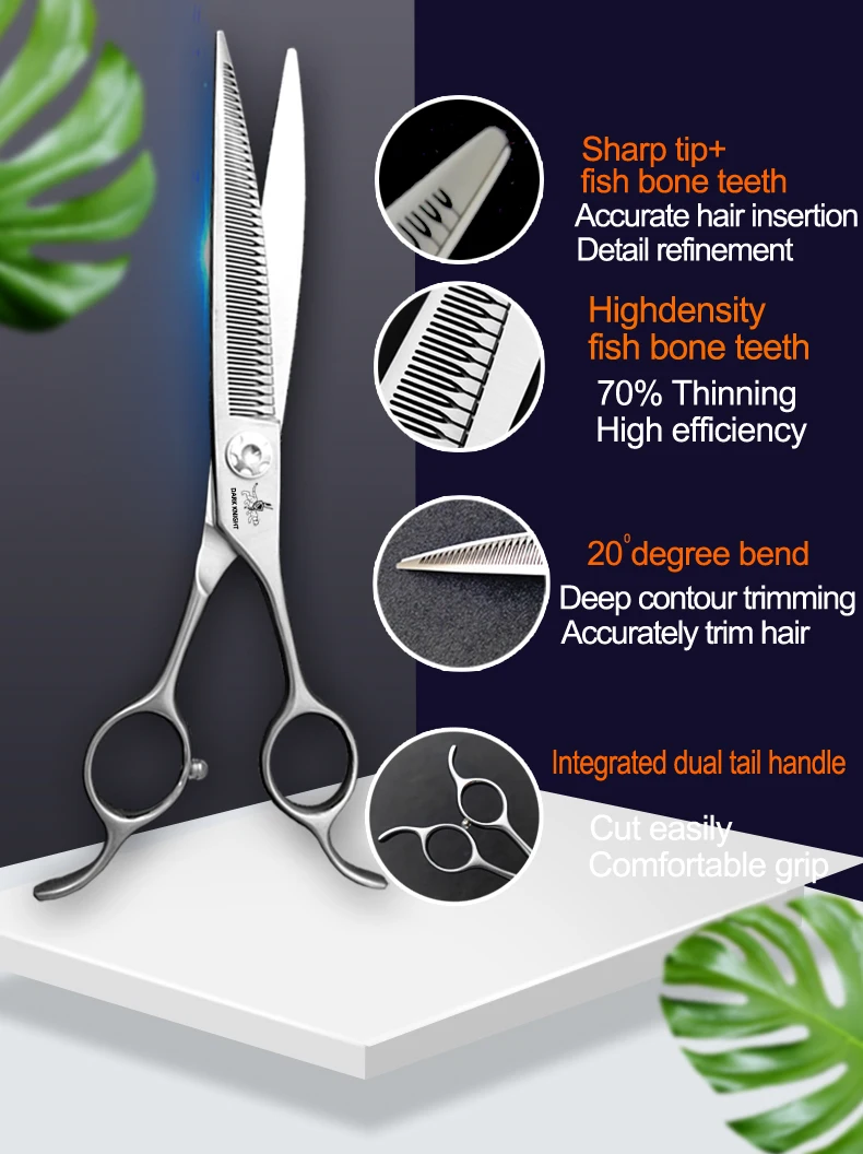 Professional pet scissors, pet beautician uses natural curved fishbone teeth scissors 440C, 7"dog hair trimming tool