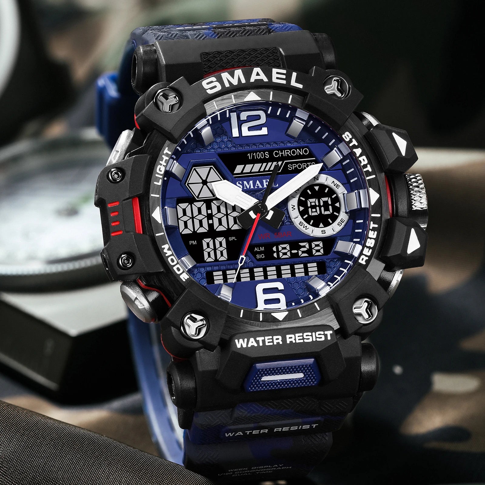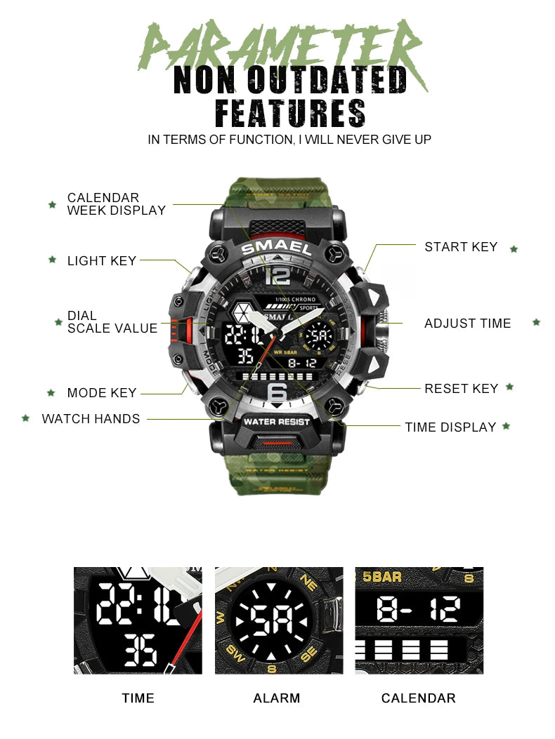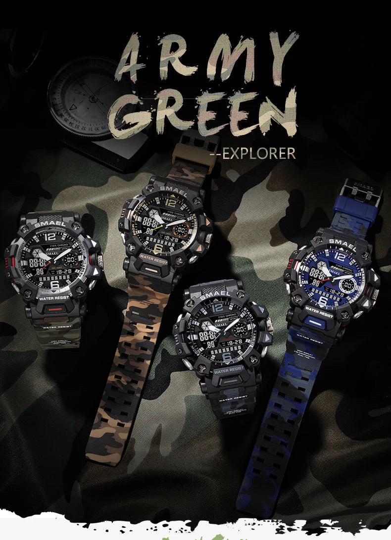 SMAEL New Watches 50m Waterproof Sports Watch Digital 8072 Army Watch Digital Quartz Dual Time Wristwatches LED for Men
