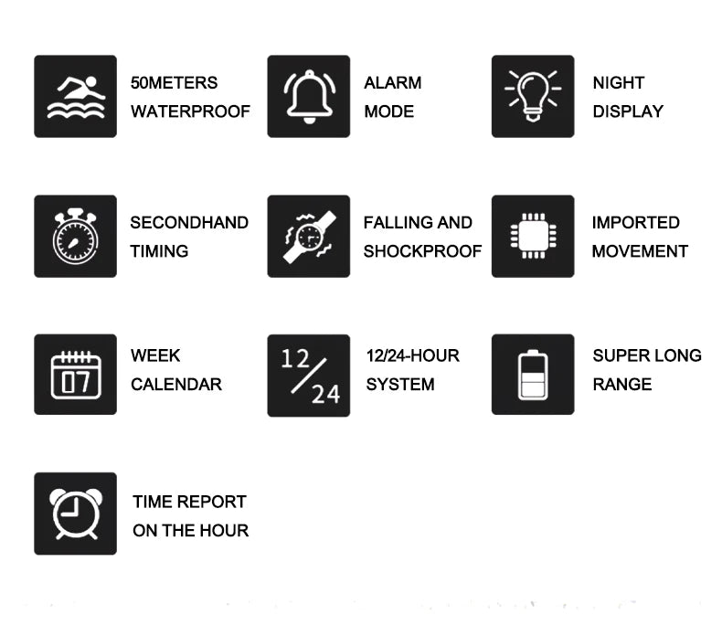 Feature: Back Light,Shock Resistant,Led Display,Alarm,Week Display
