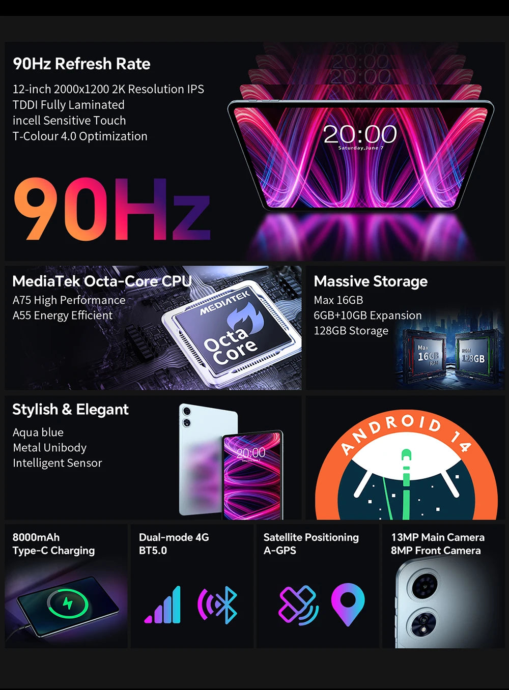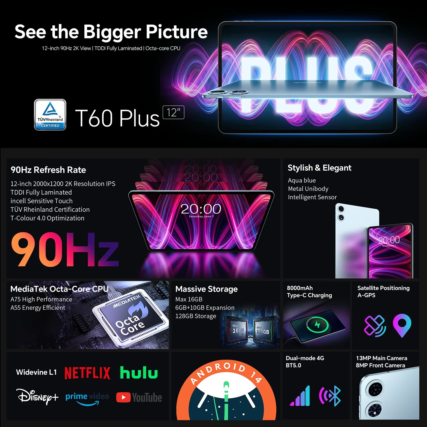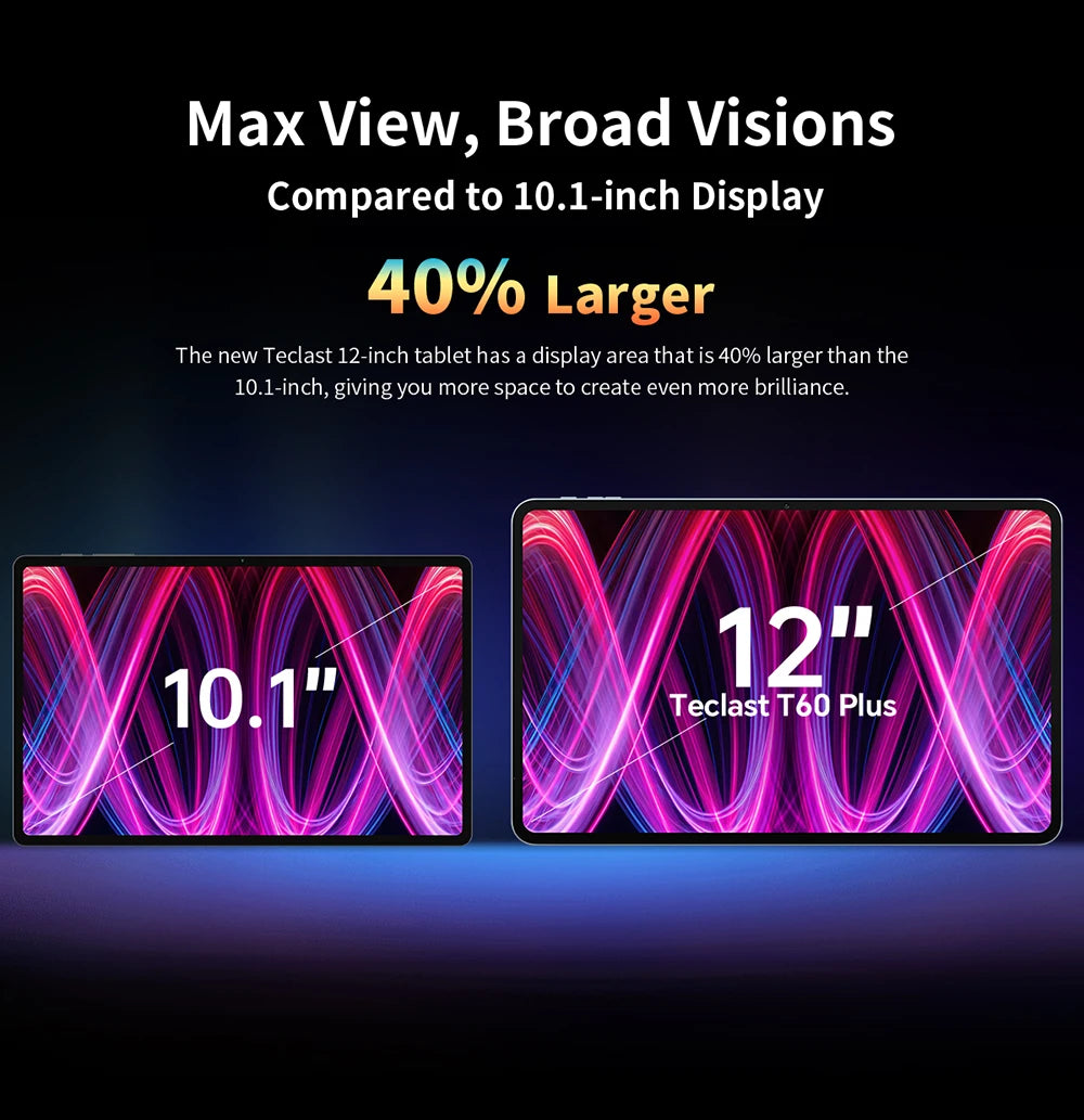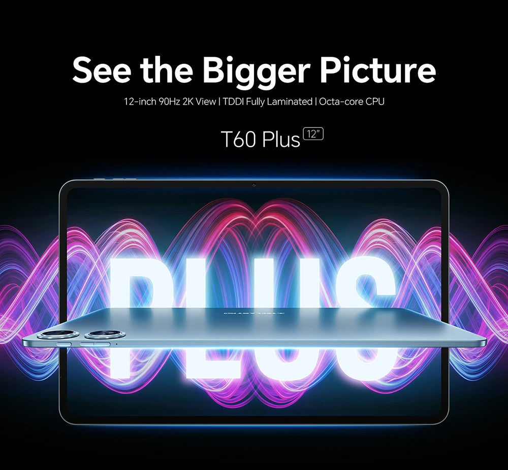 Teclast T60 Plus 12" Tablet 90Hz 2K Display Android 14 Max 16GB RAM 128GB ROM MTK G88 Octa-Core 8000mAh Widevine L1 4G LTE GPS