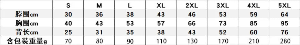 5XL:Back Length: 67CM / 22.1 inch, Chest Girth: 84CM / 33.1 inch, Neck Girth:62CM / 24.41 inch,Weight: 22-25KG / 48.5-55.12 Ibs