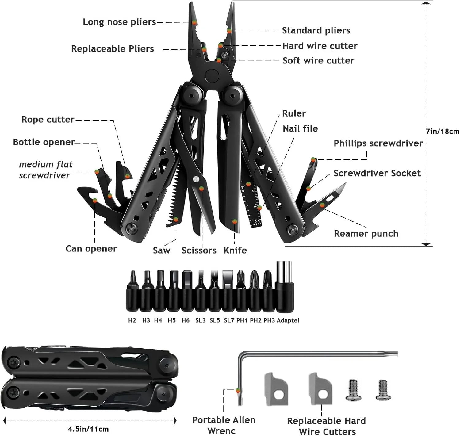 Your ultimate tool for everyday challenges! Say goodbye to cluttered toolboxes with the 28-in-1 Multitool Pliers. This all-in-one device combines regular and needle-nose pliers, wire strippers, a knife, a serrated-tooth saw, a metal file, scissors, a ruler, rope-cutting hooks, a bottle, can openers, and a hole punch. It also includes Philips-head and flat-head screwdrivers in 3, 5, and 7 mm sizes, plus a magnetic driver with 11 interchangeable bits (H2, H3, H4, H5, H6; SL3, SL5, SL7; PH1, PH2, PH3)