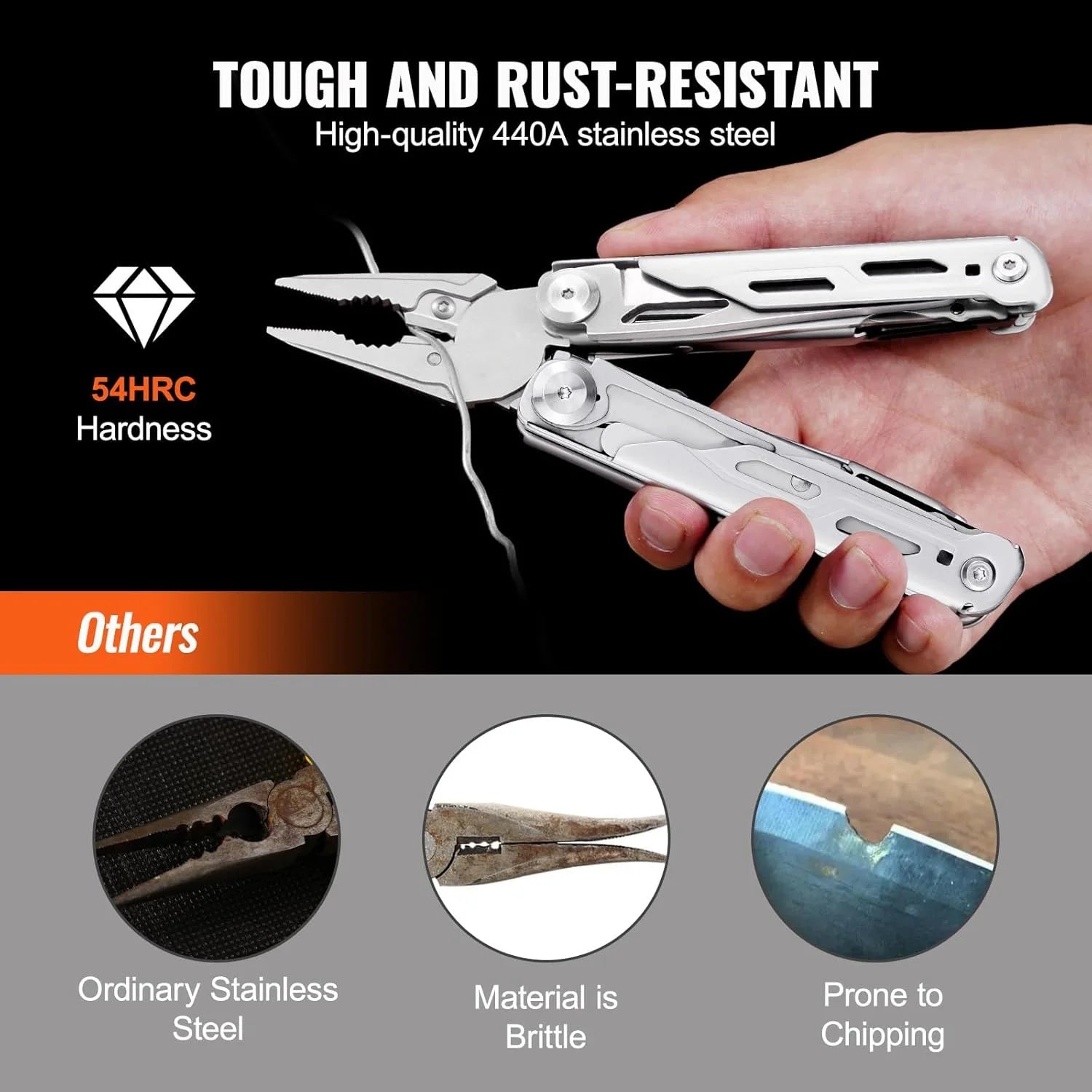 The entire body of the multi-purpose tool is made of high hardness stainless steel, making the pliers suitable for harsh and heavy environments. This portable multifunctional tool will not rust for a long time and can ensure reliable performance for many years