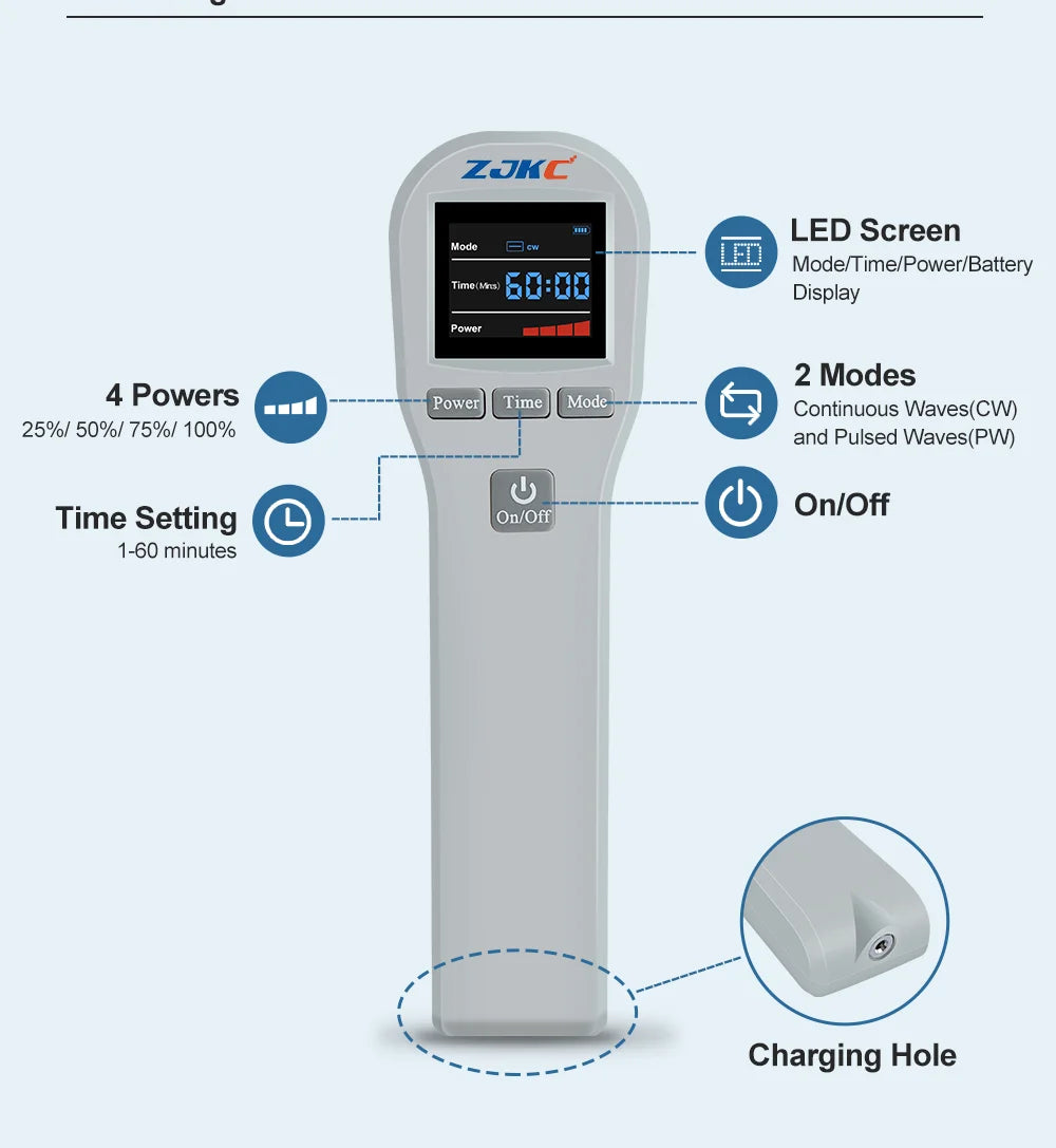 The ZJKC Cold Laser Therapy Deviceis a handheld little miracle that allows you to get professional grade joint and muscular therapy right from the comfort of your own home. Ditch expensive and time-consuming appointments with therapists and get your life back, on your own terms! Treat sports injuries, arthritic conditions, and any joint or muscular pain with this revolutionary laser device. With deep tissue penetrating lasers that are invisible to the naked eye, you'll notice quick results and more efficient recovery after working out. The Device even works on animals, so your aging pets can also experience joint relief in their twilight years.