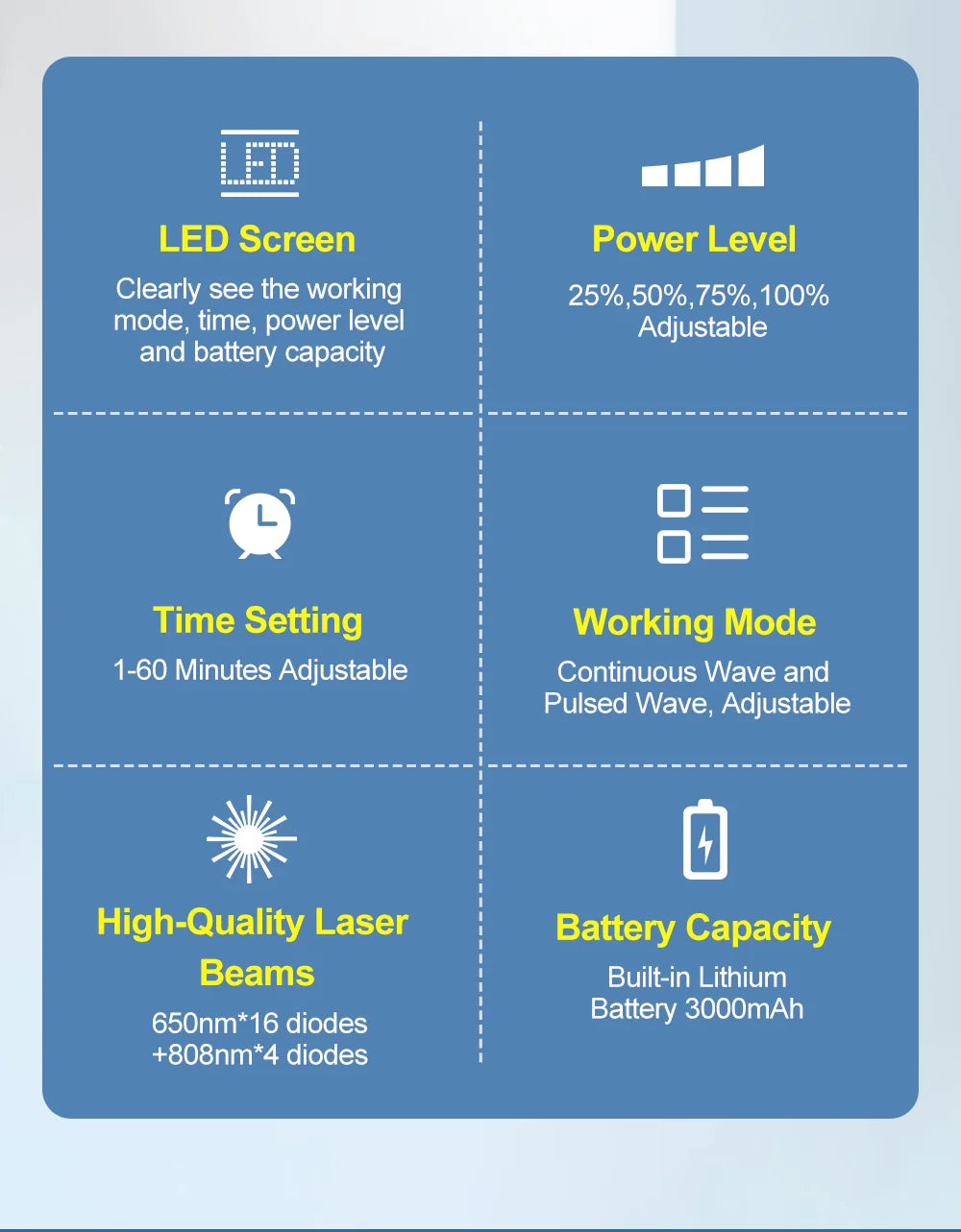 No Pain/Side Effects: Due to the low power grade of the laser therapy, the device will not cause any side effects or pain (heat included) while using this product. It is safe, non-invasive, and effective.