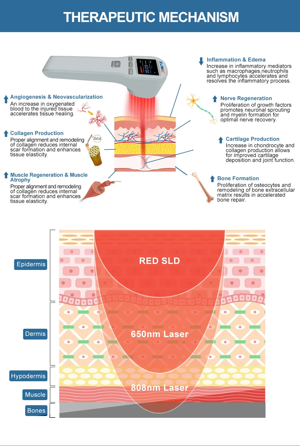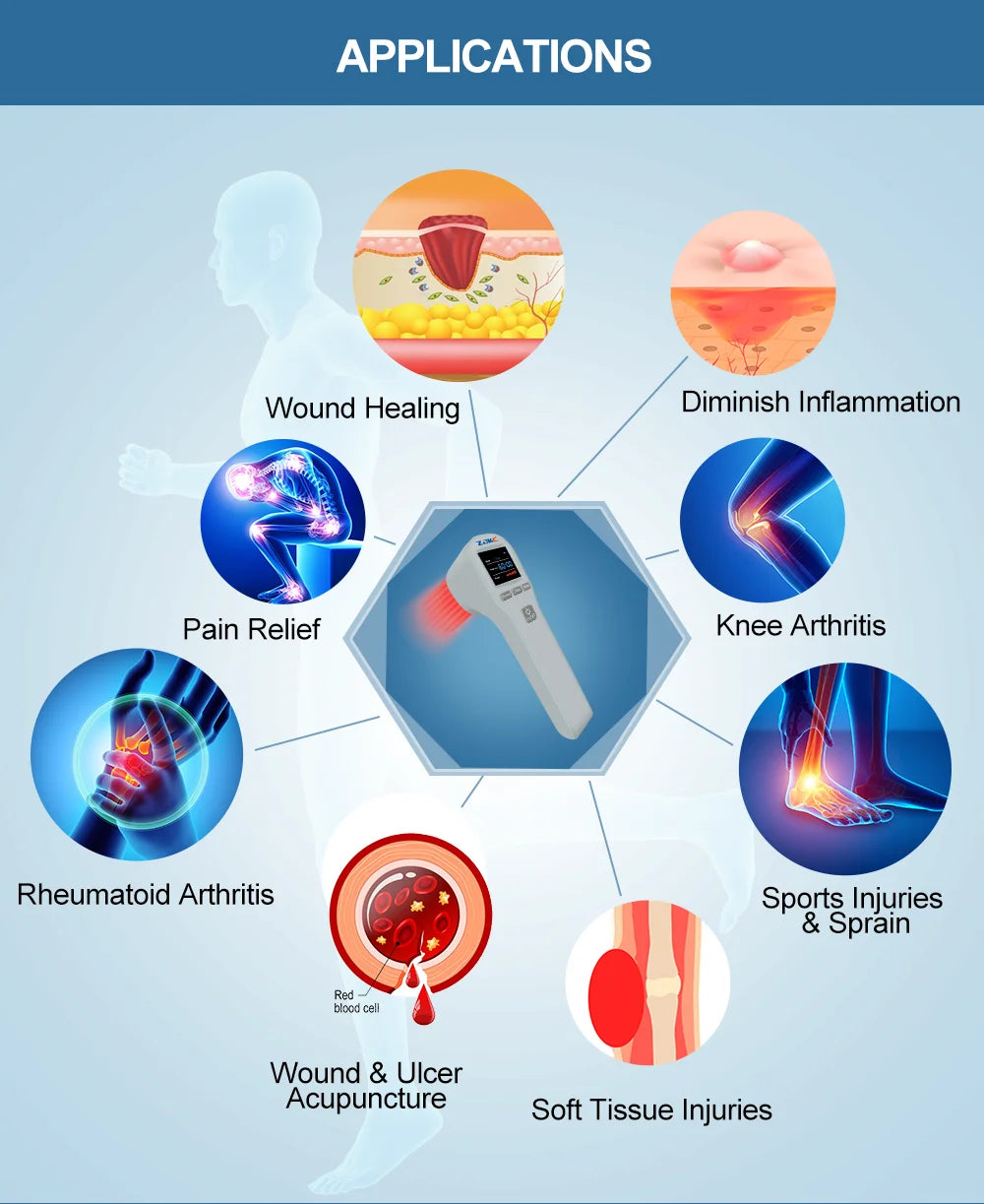 Wound Healing: Low Level Laser treatments stimulate cells and accelerate tissue regrowth, so this device can be used on wounds that need healing too. It will literally accelerate the healing process.